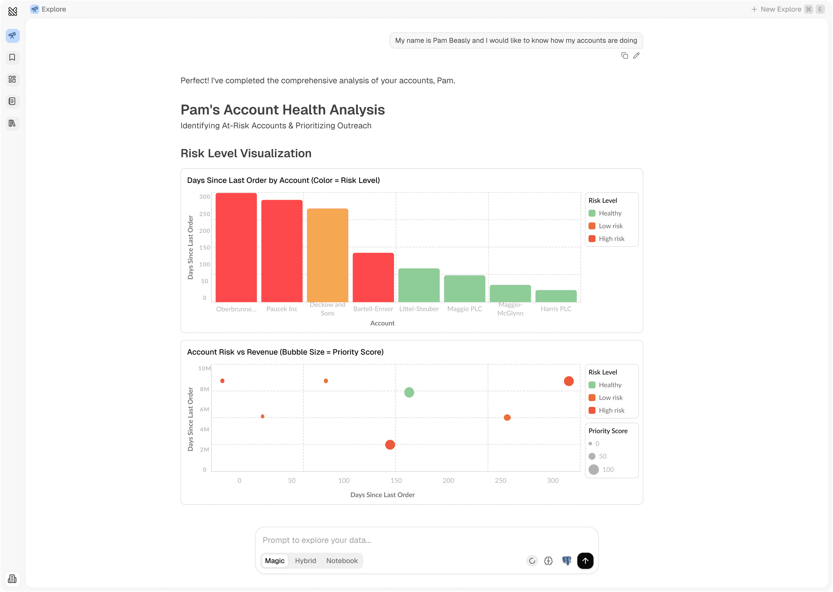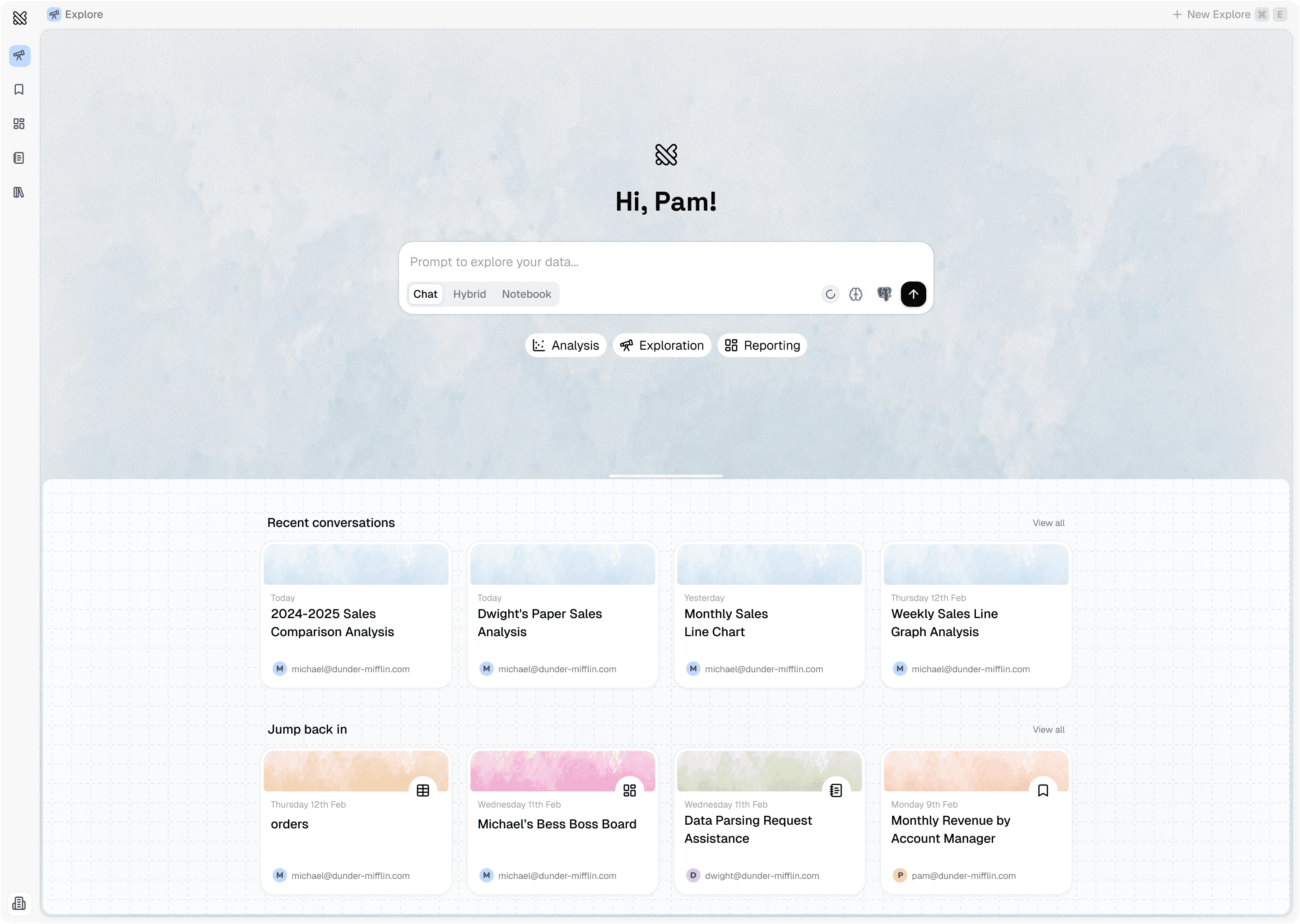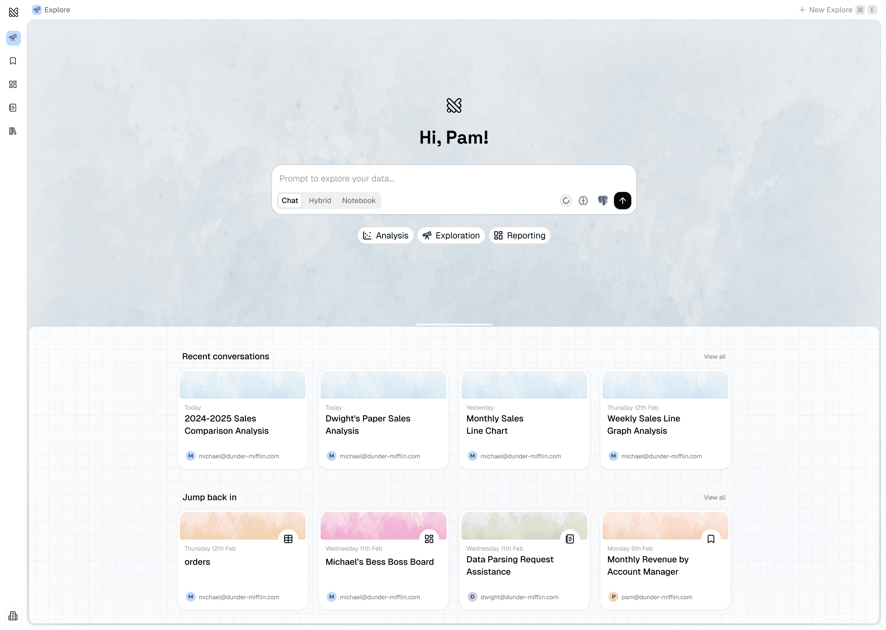 Explore is where your team asks questions so you don't need to answer all of them yourself. Every answer is just SQL or Python backed by your context.