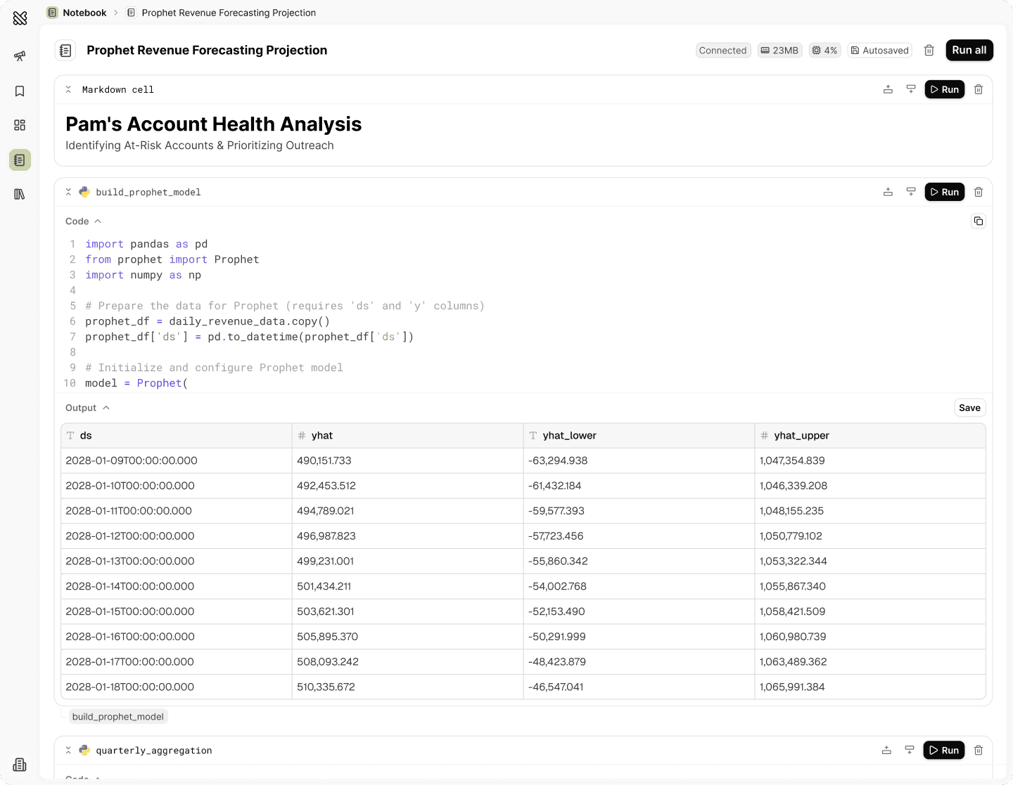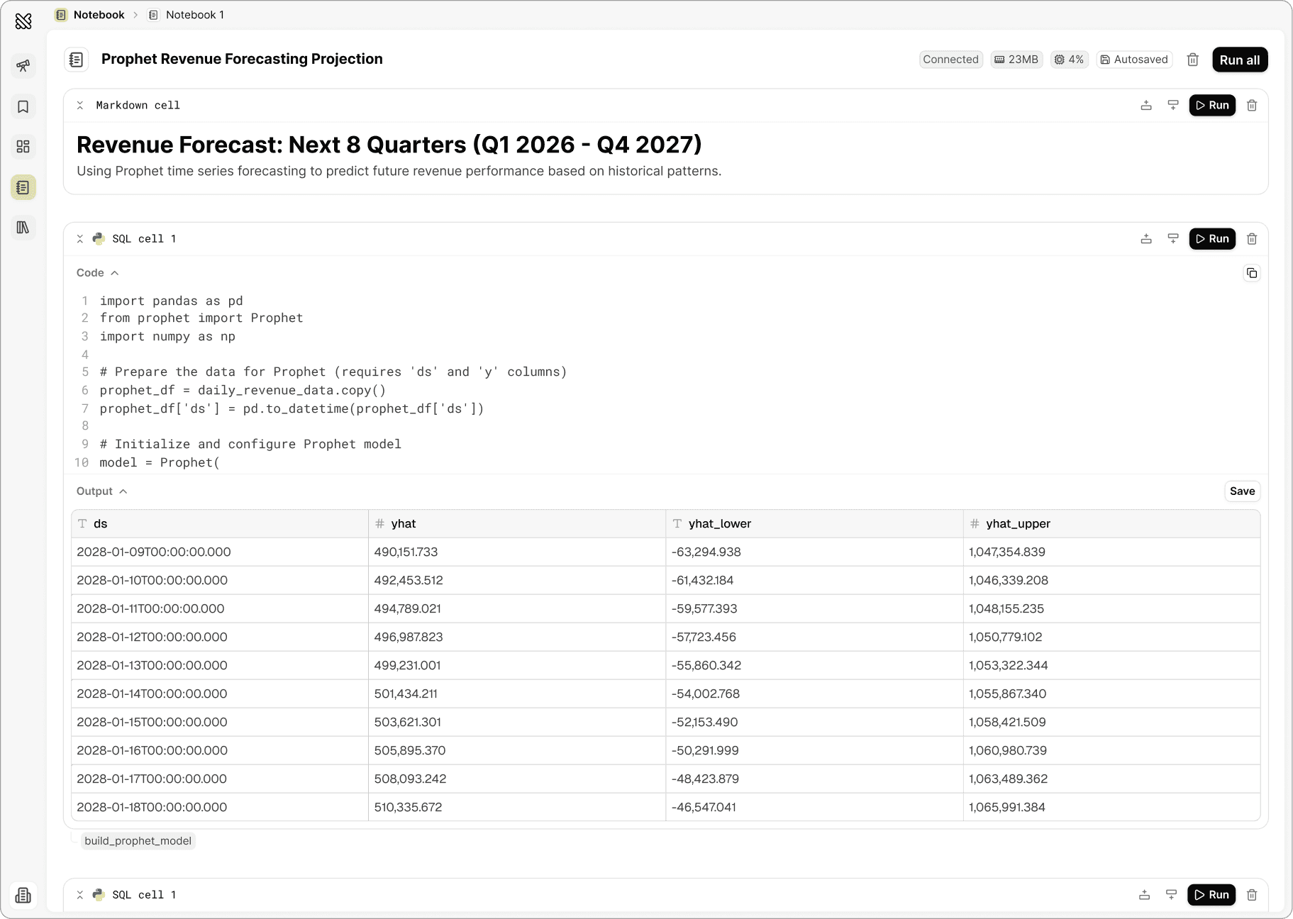 Querio’s notebook is built for real analytical work. It runs SQL, Python, and Markdown together and recomputes automatically as logic changes.