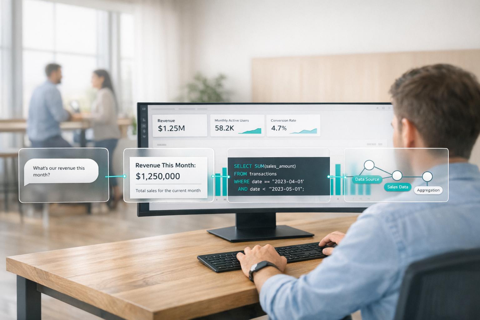 Non-technical teams can use AI analytics to query live data, get consistent metrics, and build dashboards without coding.