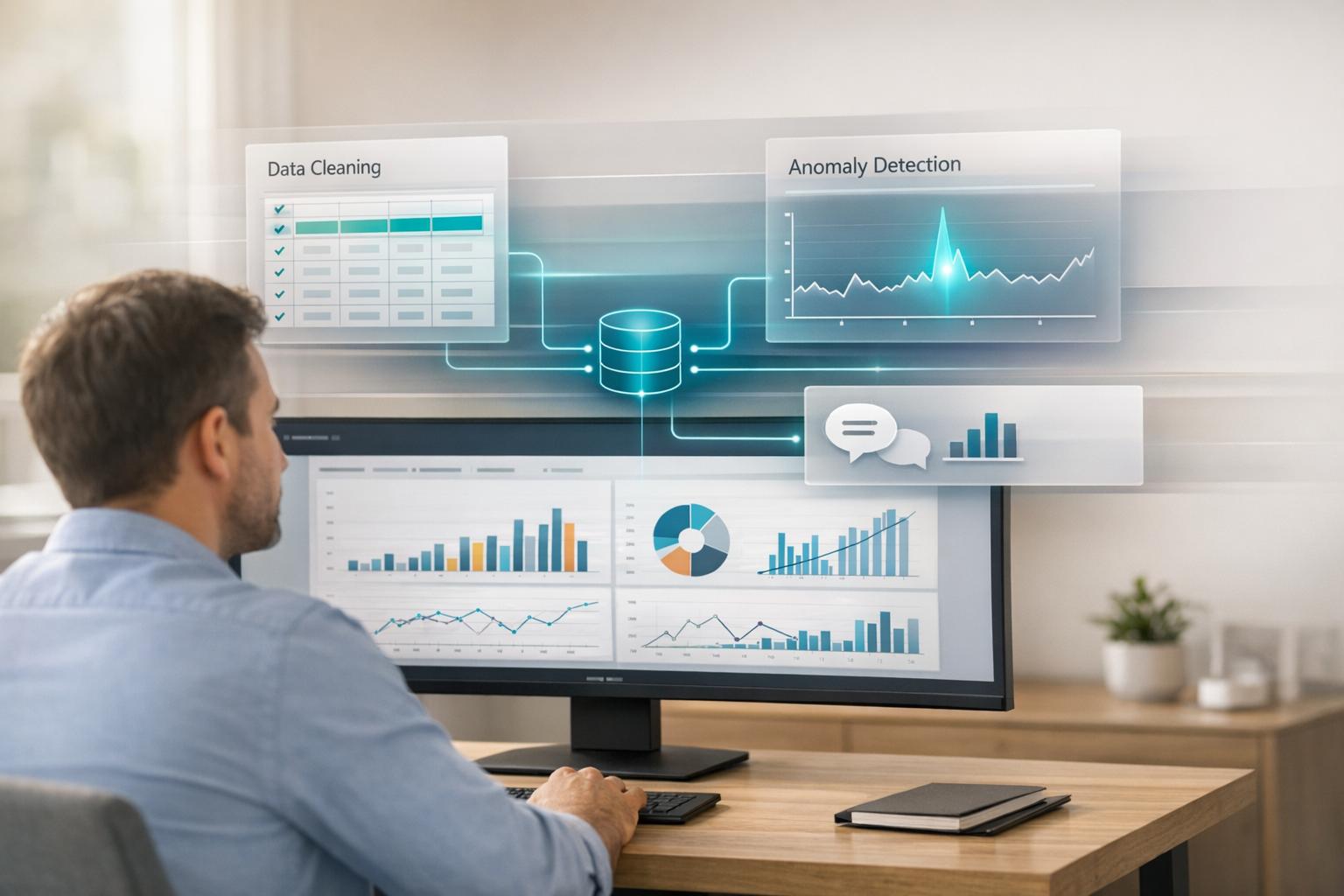 AI analytics automates data cleaning, anomaly detection, and NLQ, enforces semantic layers, and speeds workflows to improve accuracy and enable self-service.
