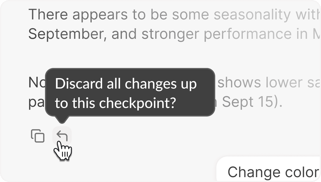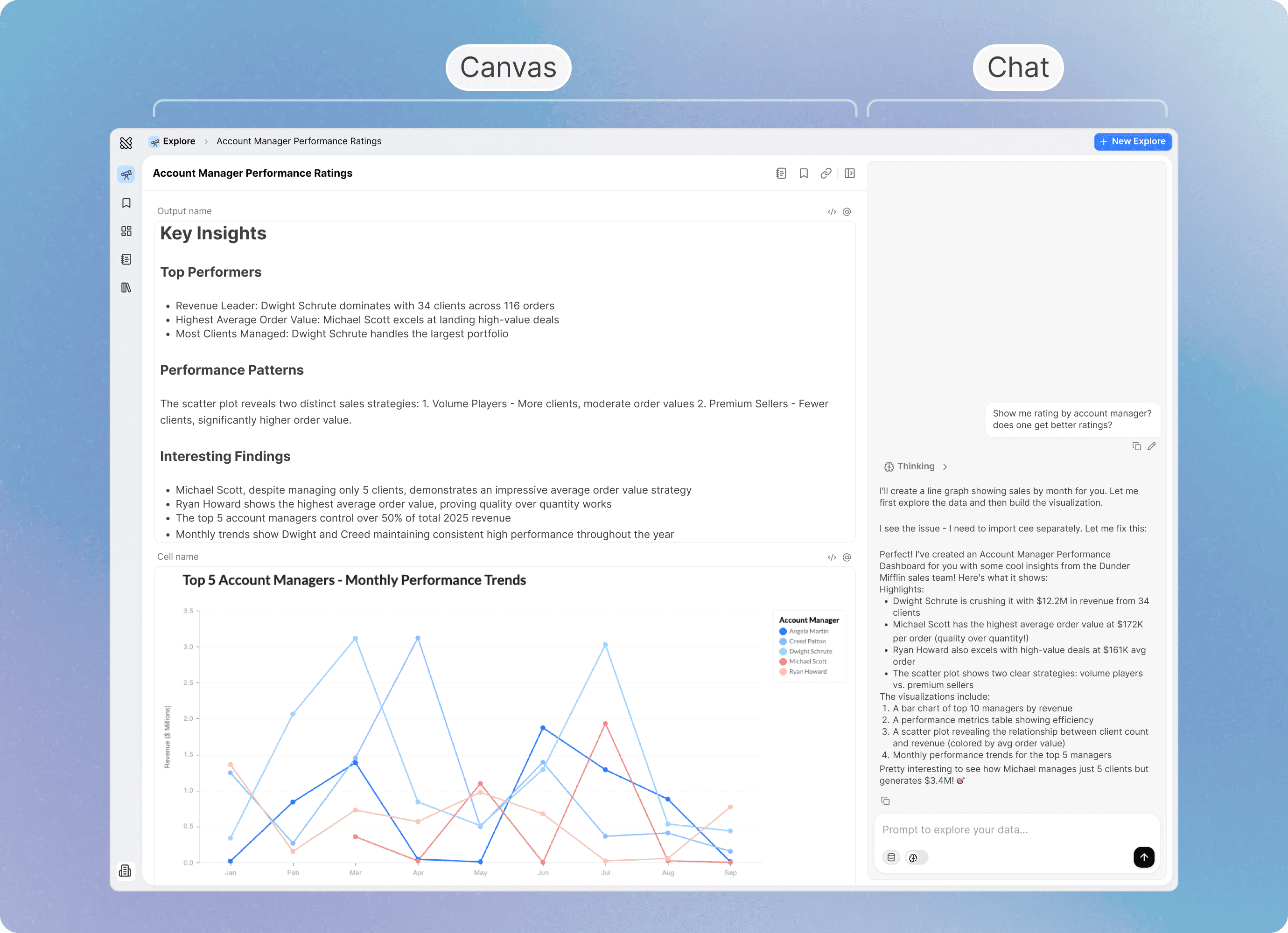 Instead of separate chat and answer flows, Explore now works fundamentally differently. Querio gives you a canvas that all your work lives in, with a permanent chat window that let’s you effortlessly explore your data.